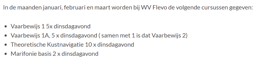 Watersportvereniging Flevo – Harderwijk Coördinatie: Dennis van Oeveren Cursus Vaarbewijs 2026 In de maanden januari, februari en maart geven we een aantal cursussen om de vaarregels beter te leren begrijpen en zo de veiligheid op het vaarwater te vergroten. Een Klein Vaarbewijs is verplicht voor iedereen die een vaartuig bestuurt uit één van de volgende …